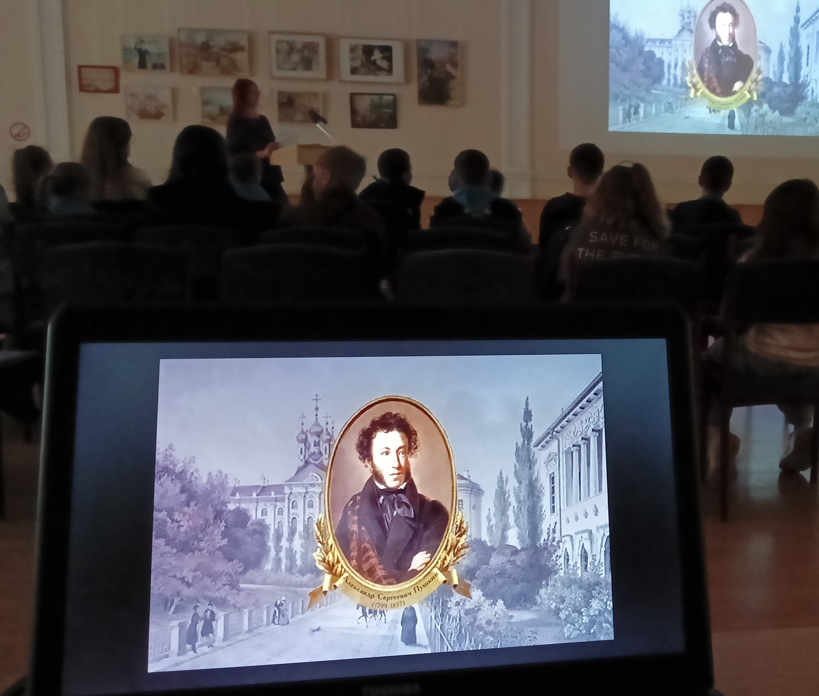 Встреча началась с приветственного слова ведущего о важности сохранения наследия А. С. Пушкина для русской культуры. Затем участникам показали презентацию с фрагментами документальных фильмов о детстве и юности поэта, обсудили его творчество, совместно прочли стихи. Это позволило лучше понять, истоки творчества Александра Сергеевича.
