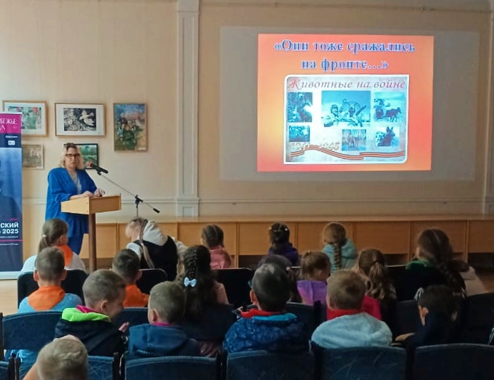 В ходе встречи ребята узнали о том, что благодаря рассказам ветеранов и ранее засекреченным документам, есть свидетельства, которые приоткрывают тайну одного из удивительных фактов Великой Отечественной войны. Оказывается, в те тяжёлые годы рядом с солдатами на фронте сражались и те, кого мы называем нашими меньшими братьями — животные и птицы.