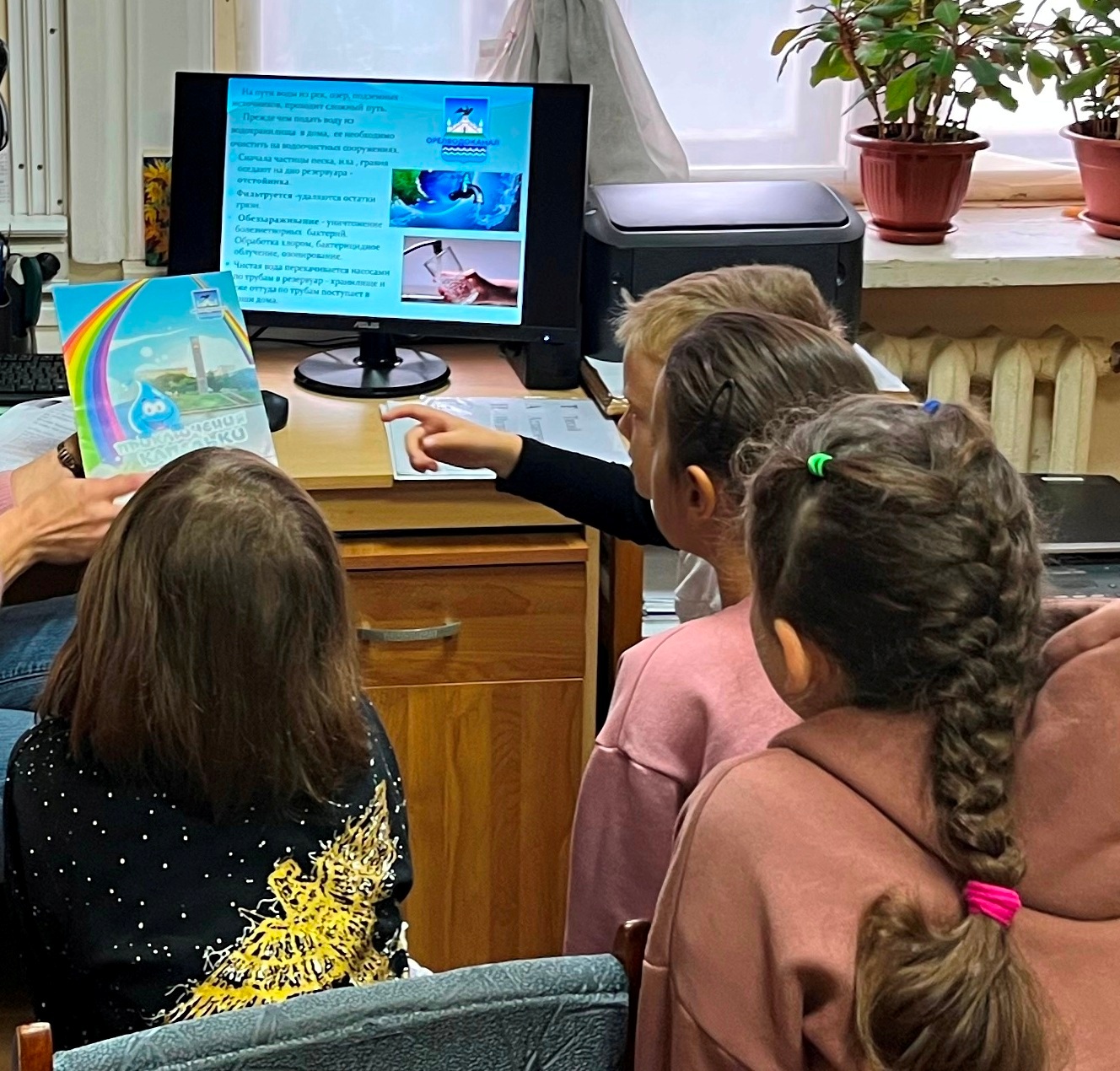 Первоклассники посмотрели мультфильм о круговороте воды в природе и познакомились с литературой из фонда отдела производственной литературы. Особый интерес у ребят вызвала книга «Приключения Капельки в городе Орле», изданная по инициативе МПХ ВКХ «Орелводоканал» г. Орла.