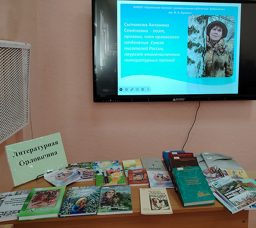 Перед присутствующими выступили писатели: Сытникова Антонина Семёновна – поэт, прозаик, член орловского областного отделения Союза писателей России, лауреат литературных премий и конкурсов, Морозова Раиса Ивановна – лирик, поэт член Союза литераторов России. Они познакомили слушателей со своими книгами. С большим интересом и благодарностью все прослушали в авторском исполнении гражданские, лирические стихи, стихи о природе, о малой родине. Выступление писателей сопровождалось мультимедийной презентацией, посвящённой их творческой деятельности. Книжная выставка «Литературная Орловщина» привлекла внимание студентов. Они с удовольствием смотрели книги и задавали вопросы.