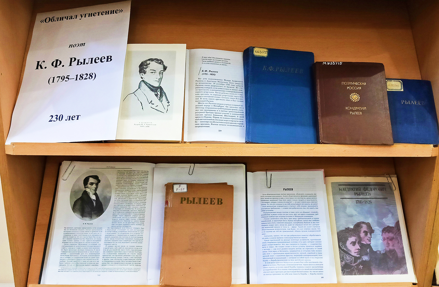 Гостям библиотеки представлена одна из наиболее известных рылеевских дум — «Смерть Ермака», ставшая символом борьбы за независимость и свободу, а также сатирические и эпиграмматические стихи, в которых он остроумно высмеивал пороки общества, лирические стихотворения, поэмы и другие произведения.