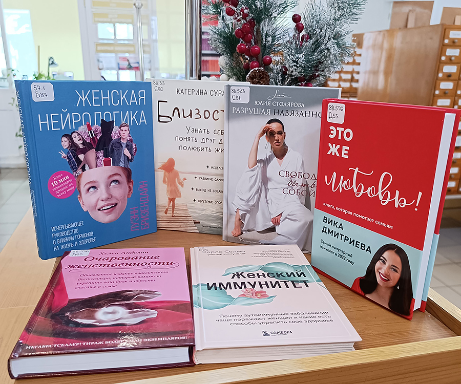 B марте мы отмечаем женский праздник, поэтому на выставке новинок, с 1 по 31 марта, представлены книги для женщин: о женской психологии и о любви. Во все времена любовь была главным источником нашего счастья, вдохновения и одновременно душевной боли. Ведь мало найти и распознать ту самую настоящую любовь, ее еще нужно не разрушить. «50 великих книг о любви» — это краткий обзор самых важных книг по психологии отношений мужчины и женщины. Книга Ники Набоковой «Вакцина от одиночества» — это истории про любовь, отношения, поиск «своего человека» и умение понимать свои собственные желания и потребности.