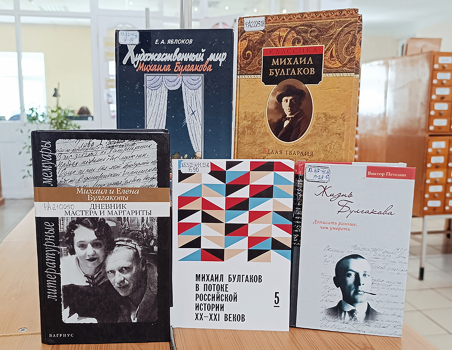 Гости библиотеки смогут познакомиться с романами, среди которых «Мастер и Маргарита» — центральное произведение Булгакова, сочетающее сатиру, мистику и философские размышления о добре и зле; «Белая гвардия» — роман о судьбе русской интеллигенции в годы Гражданской войны, во многом автобиографичный; «Жизнь господина де Мольера» — историко‑биографический роман, раскрывающий личность великого французского комедиографа. Также на выставке представлены повести и рассказы: цикл «Записки юного врача», отражающий опыт работы Булгакова в качестве земского врача; повесть «Собачье сердце» — острая сатира на социальные эксперименты и утопические идеи начала XX века; повесть «Роковые яйца» — научно-фантастическое произведение с элементами предупреждения о последствиях вмешательства в естественные процессы; рассказы из сборника «Дьяволиада».