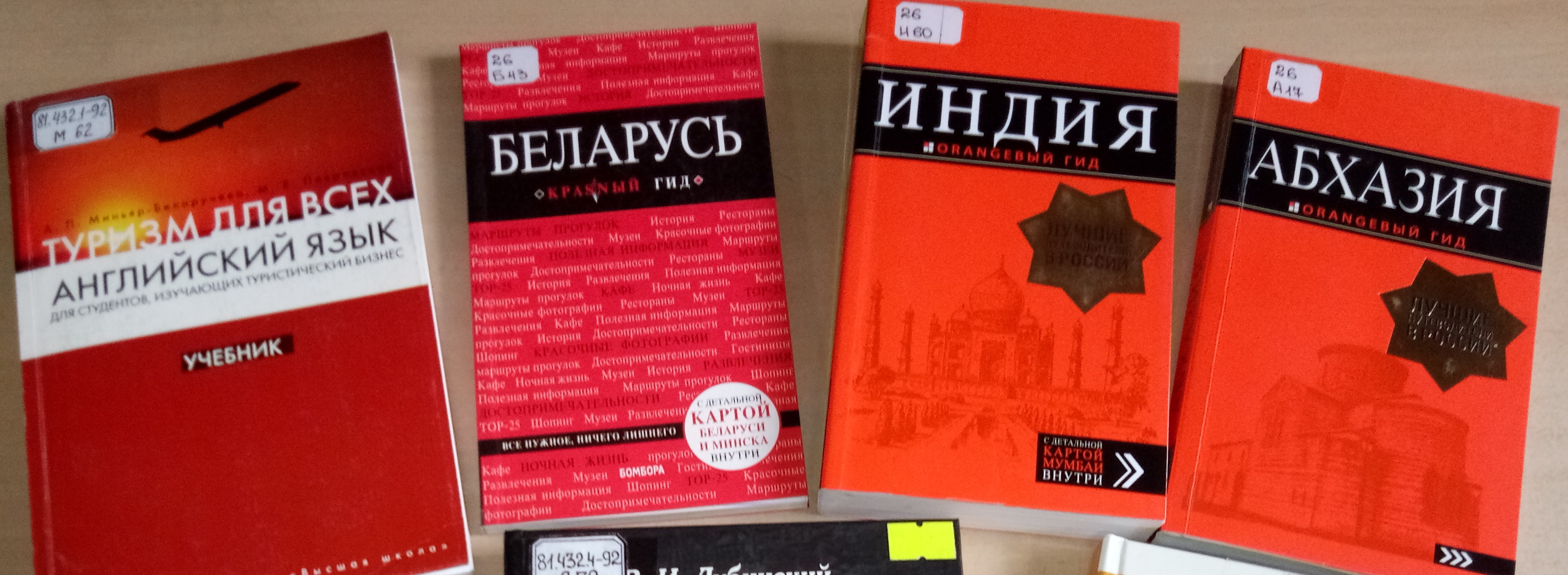 На выставке представлены путеводители на русском языке по разным странам, а также учебники английского и немецкого языка для вузов туристического профиля.