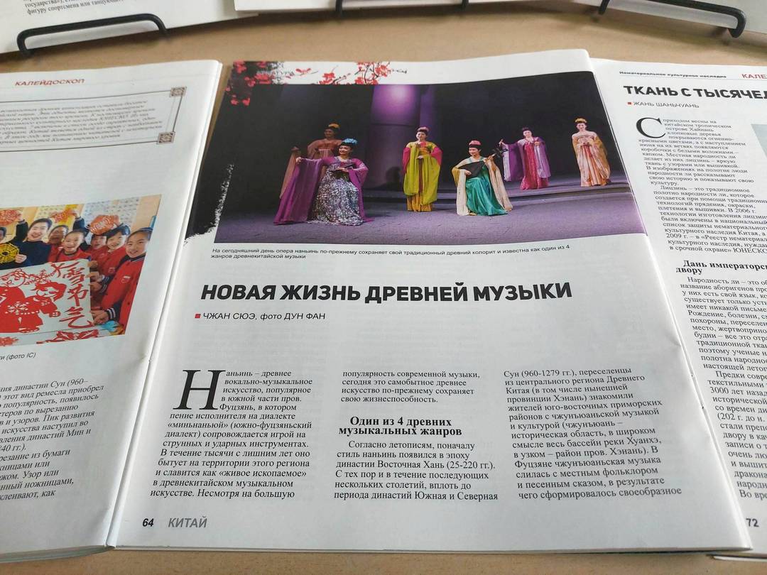 На выставке представлены выпуски журнала «Китай» с разнообразной информацией о нематериальном культурном наследии Китая.