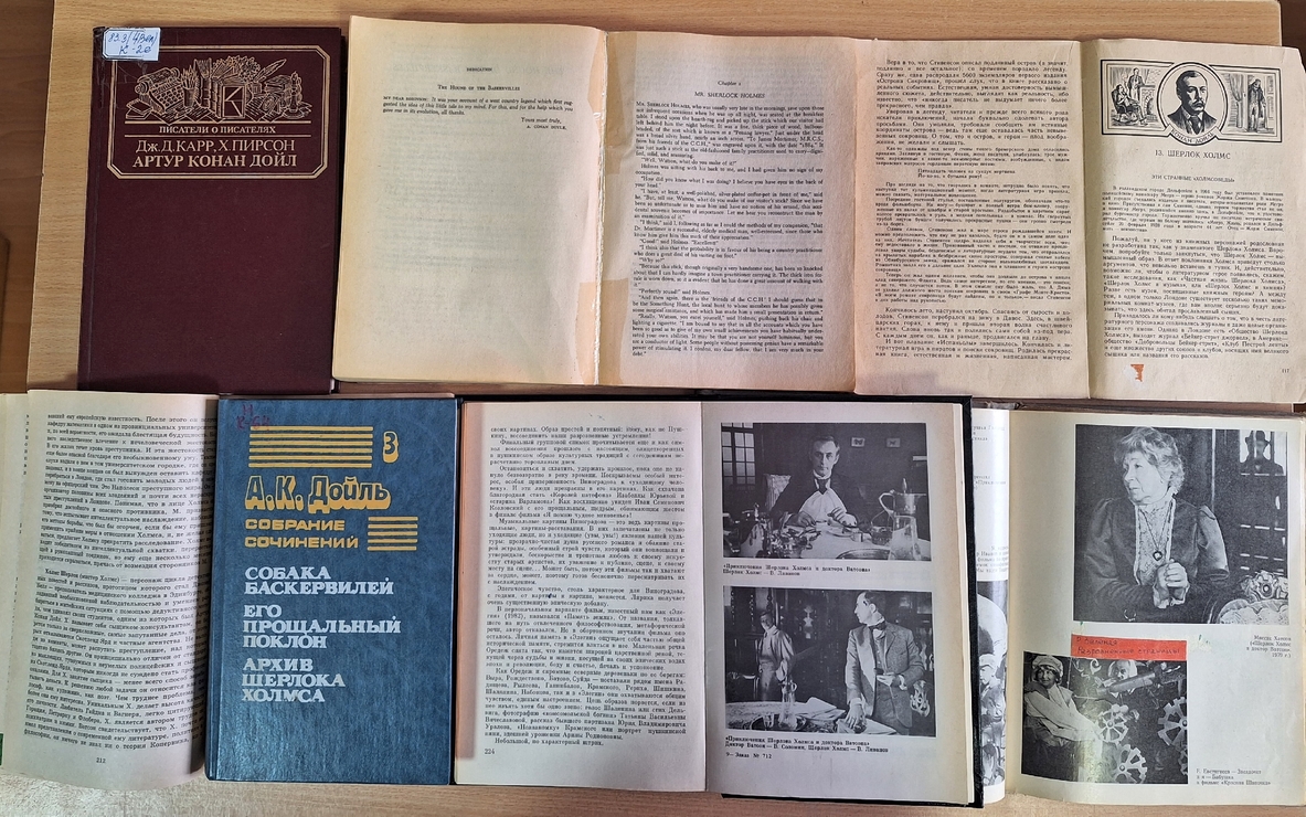 На экспозиции представлены: детективная повесть «Собака Баскервилей» на русском и английском языках, разных издательств и лет, книги и журналы о жизни Артура Конан Дойля, кадры из экранизаций и портреты главных героев. Приглашаем всех окунуться в удивительный мир детектива вместе с Артуром Конан Дойлем!