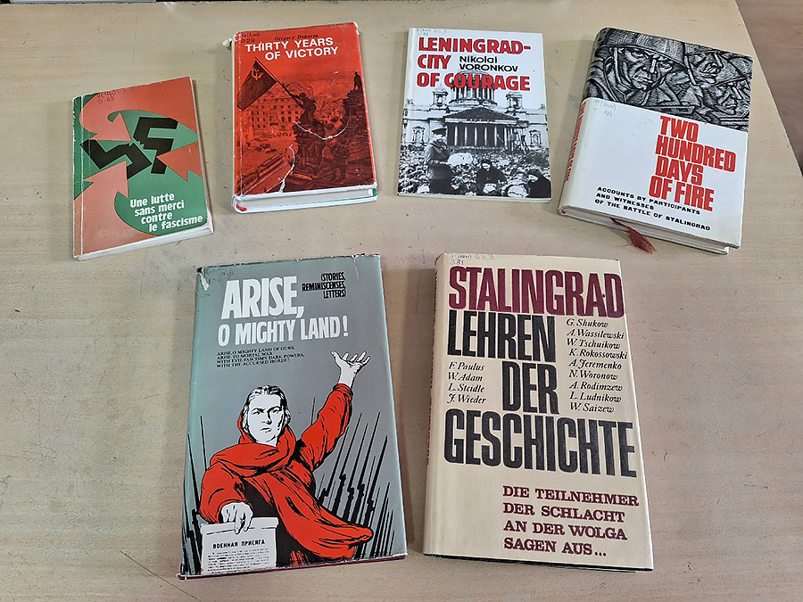 Также вниманию посетителей экспозиции представлены издания на французском языке об участии советского морского флота в Великой Отечественной войне, о роли антигитлеровской коалиции (на немецком языке); книга маршала Советского Союза Г. К. Жукова «Воспоминания и размышления» на немецком языке, книга маршала Советского Союза И. С. Конева «Сорок пятый» на английском языке и другие издания.