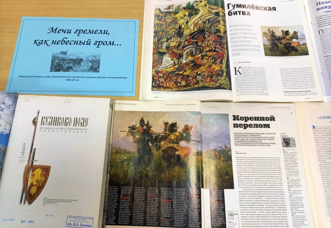 С 18 сентября по 2 октября 2025 года в зале периодики Орловской областной библиотеки им. И. А. Бунина работает выставка «Мечи гремели, как небесный гром». Экспозиция приурочена к Победе русских полков во главе с Дмитрием Донским над монголо-татарскими войсками в Куликовской битве (1380) 645 лет, который отмечается 21 сентября.