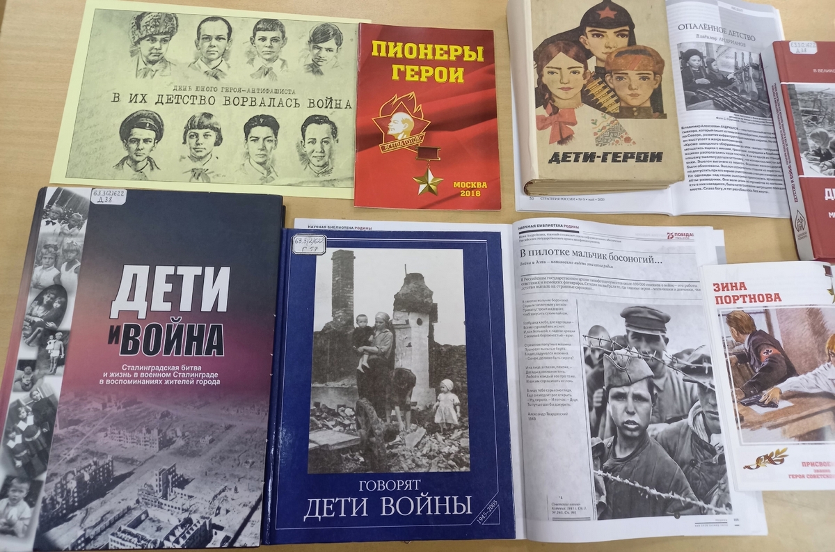 На выставке представлены материалы, позволяющие вспомнить имена и почтить память пионеров-героев: Лени Голикова, Вали Котика, Зины Портновой, Марата Казея и многих других ребят, отдавших жизнь за свободу Отечества. Отдельная часть экспозиции посвящена подвигу юных героев-молодогвардейцев. Особого внимания заслуживает подборка журналов «Родина», повествующая о тяжелой жизни и самоотверженном труде детей блокадного Ленинграда. Не менее интересен сборник «Дети – герои» (М.:1984), являющийся своеобразной энциклопедией детского подвига в годы вооруженной борьбы за Советскую власть и на фронтах Гражданской и Великой Отечественной войн.