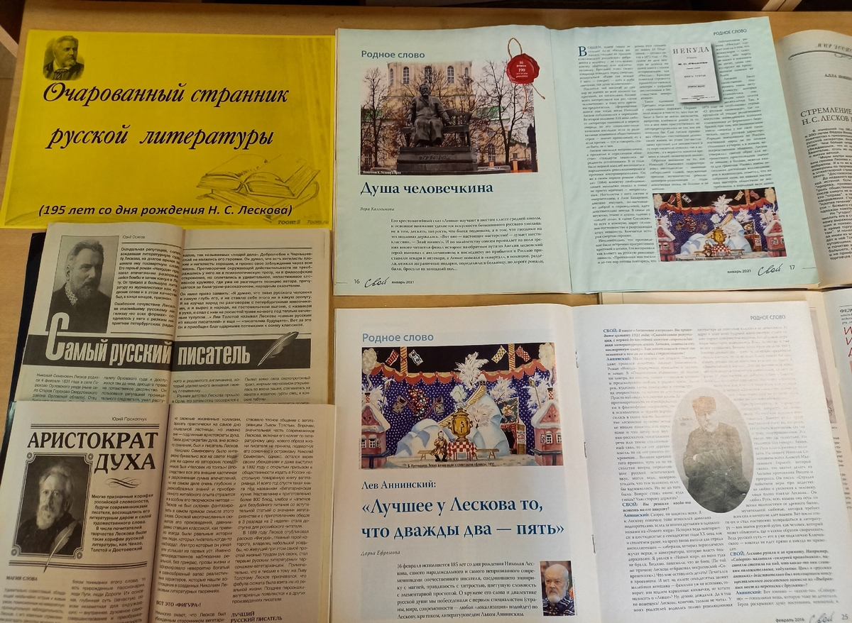 С 12 по 26 февраля в зале периодики Орловской областной библиотеки им. И. А. Бунина работает выставка «Очарованный странник русской литературы», посвященная 195-ой годовщине со дня рождения русского писателя, нашего земляка Николая Семеновича Лескова (1831 – 1895), который отмечается 16 февраля.