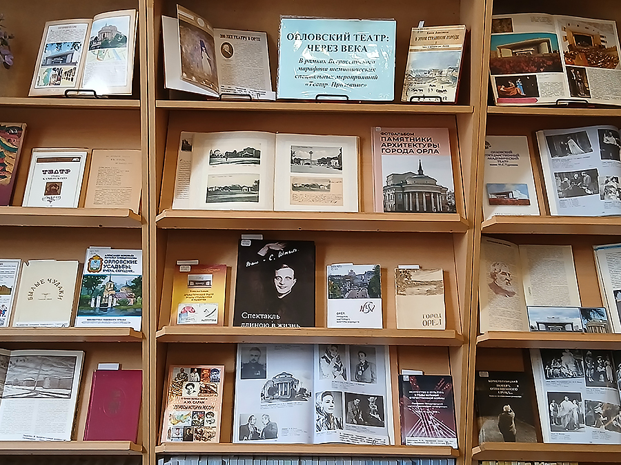 На выставке представлены книги и статьи из книг, посвященные вехам развития Орловского театра и людям театра: Л. Афонин «Повесть об Орловском театре», «Бывалые чудаки в Орловской губернии», «На открытие театра в Орле. 25 сентября 1815», Е. В. Яворская «Из истории Орловского театра», А. М. Ставцева «Архитектура города Орла конца XVIII начала ХХ веков и проблема охраны исторического архитектурного наследия города», А. Ю. Саран «Вопросы истории России», «В театральном Тургеневском Доме (Очерки об Орловском государственном академическом театре имени И. С. Тургенева» и другие издания.