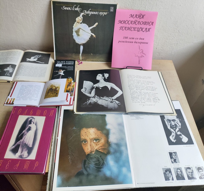 На выставке представлена литература, повествующая о ее творческом пути и победах. Книга Поэля Карпа «Младшая муза», где лёгким и живым языком рассказывается о балетном искусстве и знаменитых балеринах, среди которых, конечно, сияет Майя Плисецкая. Сборник «Большой театр. Великие имена» под редакцией Н. А. Андреевой, сборник дневниковых записей и заметок выдающегося танцовщика В. С. Лагунова, полный теплых и трепетных воспоминаний о Майе Михайловне, а также богато иллюстрированные альбомы Ю. Н. Григоровича и С. А. Лушина «Большой театр СССР», где вы сможете увидеть балерину в её коронных ролях.