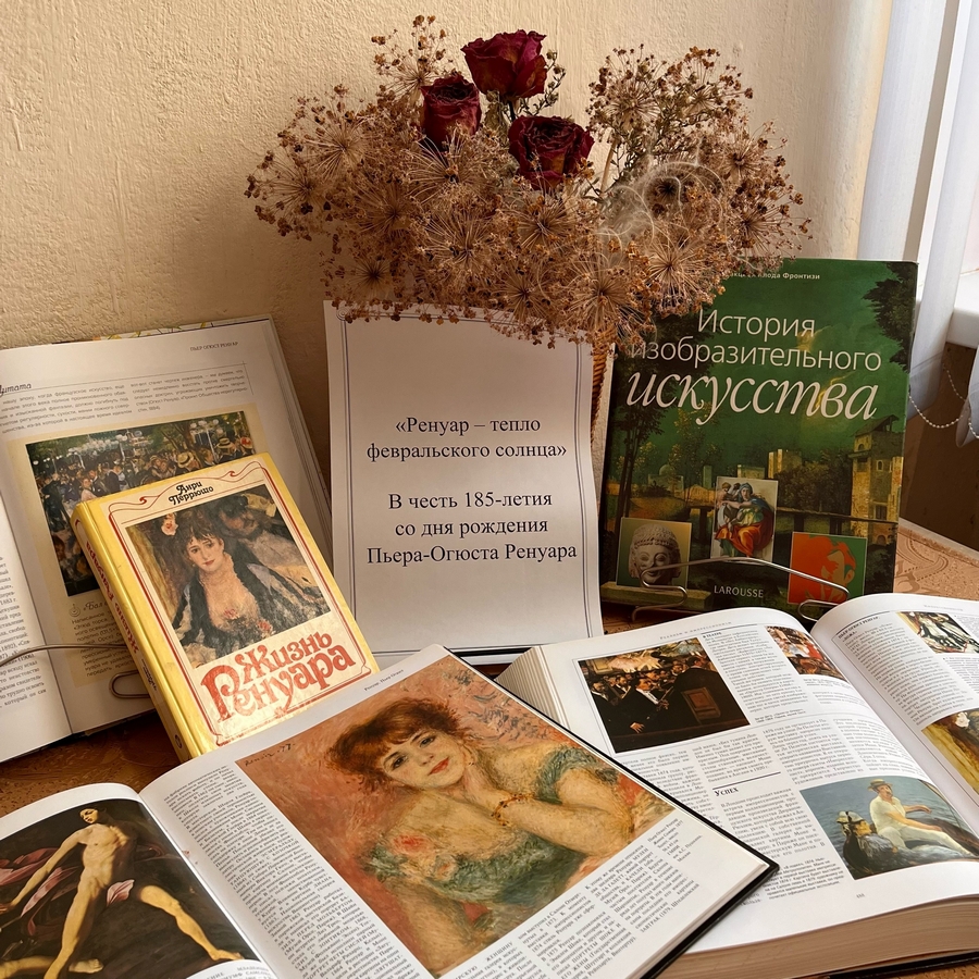 С 18 февраля по 4 марта в отделе искусств Орловской областной библиотеке работает выставка «Ренуар – тепло февральского солнца», приуроченная к 185-летию со дня рождения французского художника П. О. Ренуара.