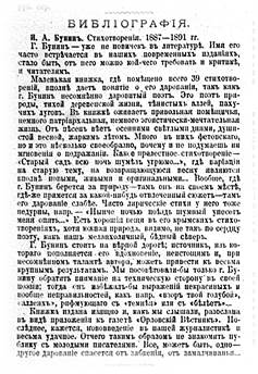 Небольшая неподписанная заметка в разделе «Библиография» на стр. 106 этого журнала была к Бунину безжалостна [12]. Согласно библиографии С. Н. Морозова, она принадлежит Ивану Ивановичу Иванову, который выступал в печати как литературный и театральный критик. 4 года спустя, в 1896-м, Иванов опубликовал увесистый том жизнеописания другого нашего земляка – Ивана Тургенева (эта книга доступна онлайн на многих ресурсах [13], в т.ч. на сайте университетской библиотеки Торонто).