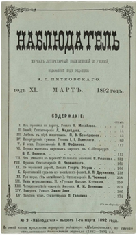 «Наблюдатель» выходил ежемесячно 1-го числа и без предварительной цензуры (25-30 печатных листов). Годовая подписка стоила 12 рублей. Для сравнения, за третье издание полного собрания сочинений Тургенева, вышедшее в 1891 году в 10 т., просили 15 руб. (с пересылкой 17 руб.)