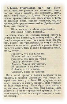 «Нет, лучше, по-нашему, совсем не писать стихов, чем облекать в них голую прозу. Что-нибудь одно: или проза, или поэзия. И на всё есть своя форма», пишет Иванов о стихах юного Бунина. И с явной издёвкой заключает: «Быть может г. Бунин – прекрасный прозаик. В таком случае, пусть он скорее покидает занятие поэзией».