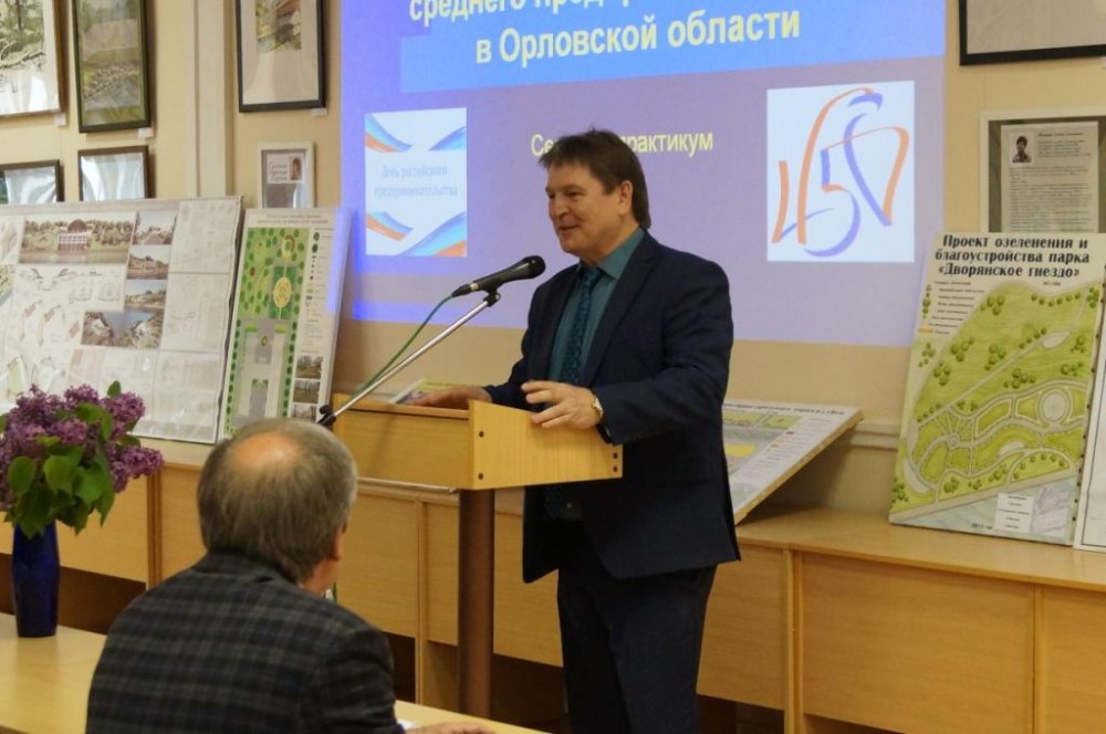 На семинаре-практикуме «Современное состояние и перспективы развития малого и среднего предпринимательства в Орловской области», проходившего в областной библиотеке им. И. А. Бунина выступает мэр города Орла Новиков Василий Федорович