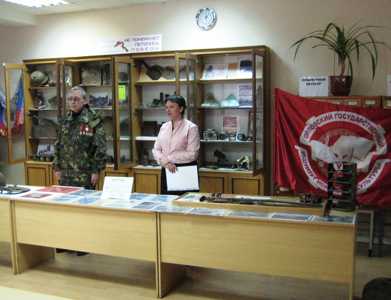 Патриотический час, посвященный деятельности Молодежного общественного объединения «Огненная дуга». На снимке Андреев Николай Анатольевич – директор музея Орловского филиала Российской Академии народного хозяйства и Государственной службы при президенте РФ (РАНХиГС), председатель Молодежного общественного поискового объединения «Огненная Дуга». Выступает Бухтиярова С. В. – заведующая отделом производственно-технических документов Орловской областной библиотеки им. И. А. Бунина