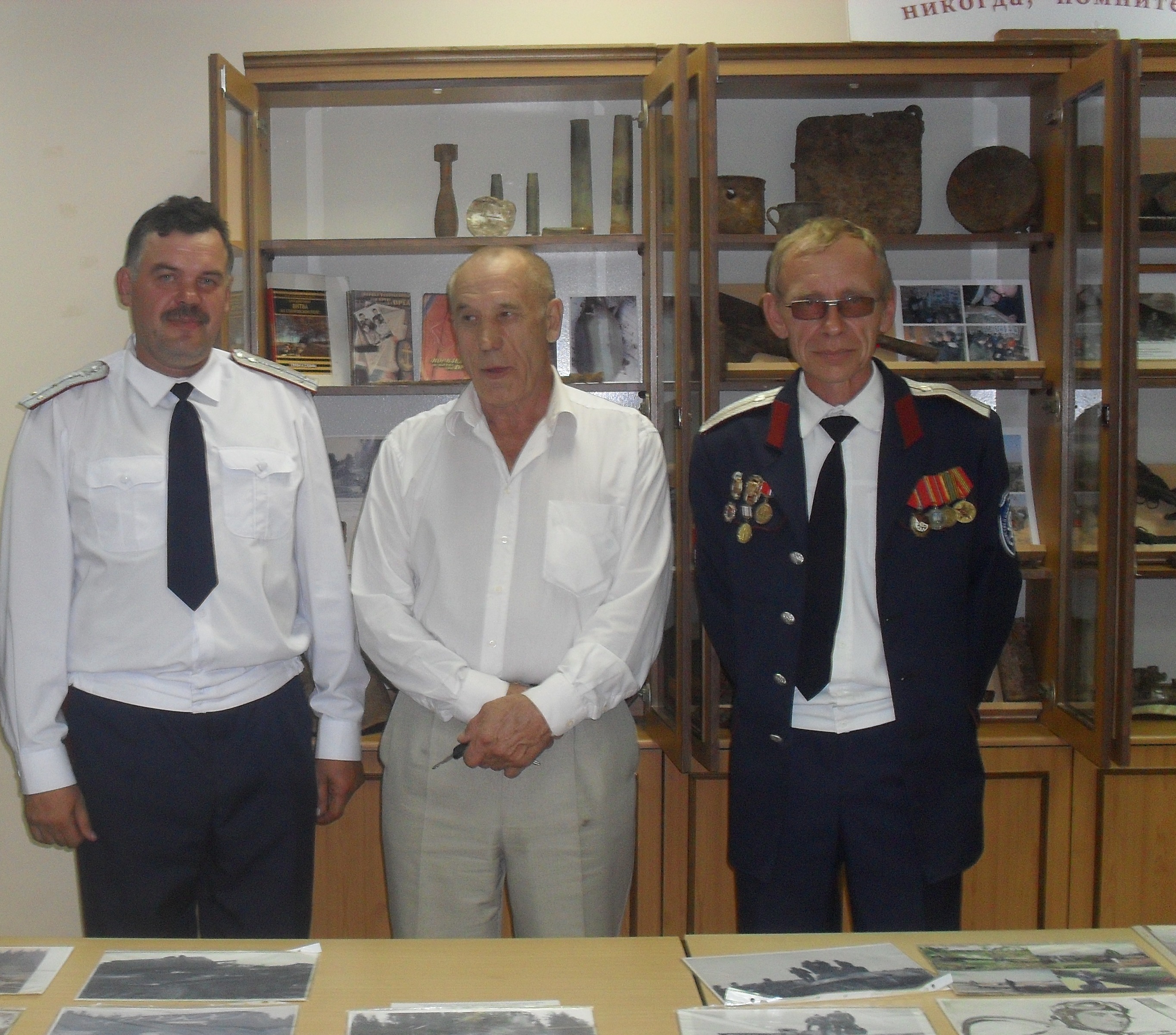 Участники социально-культурной акции «Ночь в библиотеке», посвященной 70-летию освобождения г.Орла и Орловской области от фашистских захватчиков. Слева направо: – Невров С. А., руководитель Орловской кадетской школы при Доме творчества Заводского района г.Орла, атаман Орловского городского казачьего общества войскового казачьего общества «Центральное казачье войско» (ОГКО ВКО «ЦКВ»); Щекотихин Е. Е., доктор исторических наук; Андреев Н. А., директор музея Орловского филиала Российской Академии народного хозяйства и Государственной службы при президенте РФ (РАНХиГС), председатель Молодежного общественного поискового объединения «Огненная Дуга»