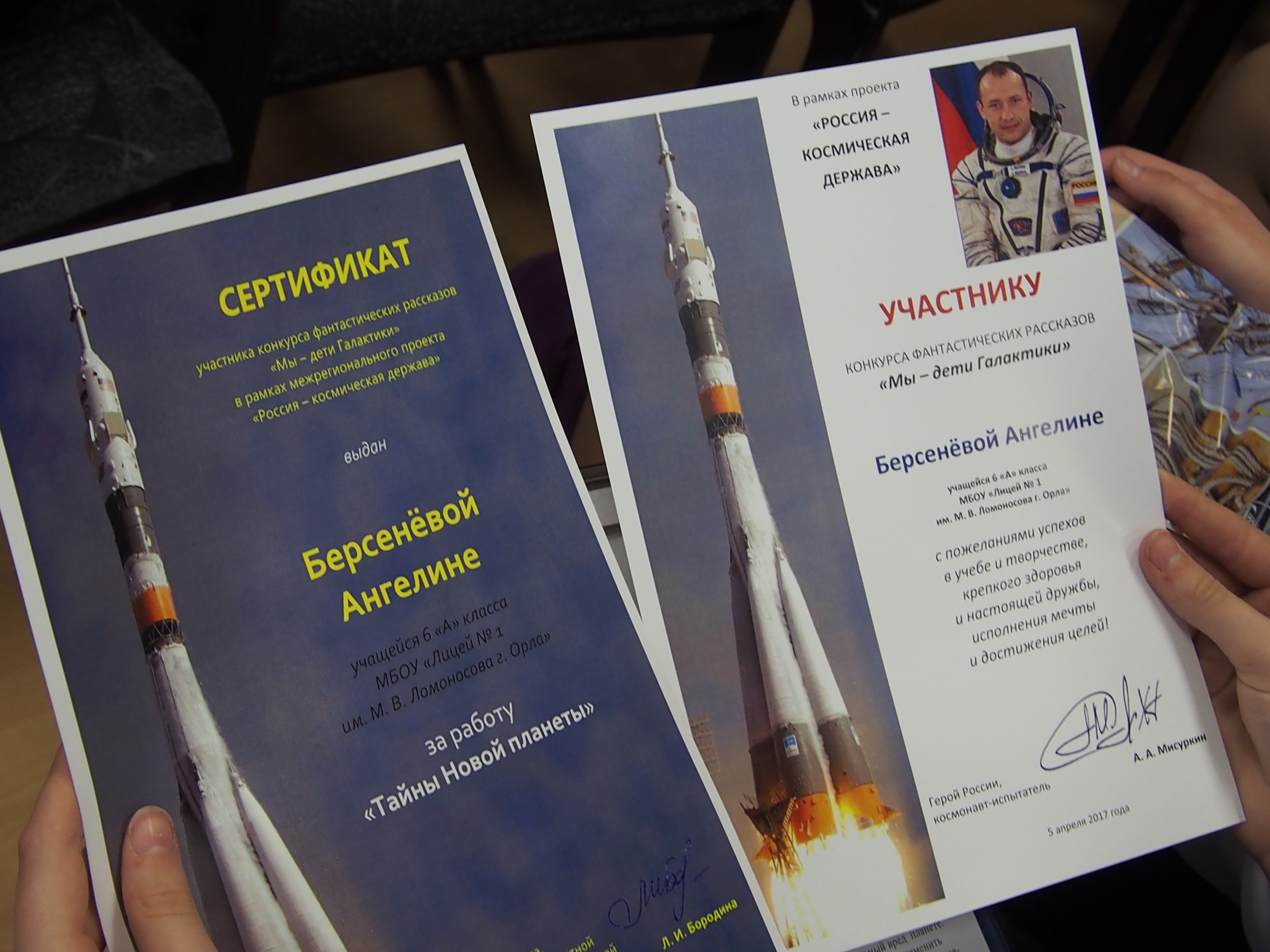 Наградной материал для участников проекта «Россия – космическая держава» с автографом Героя России, орловского космонавта Александра Мисуркина