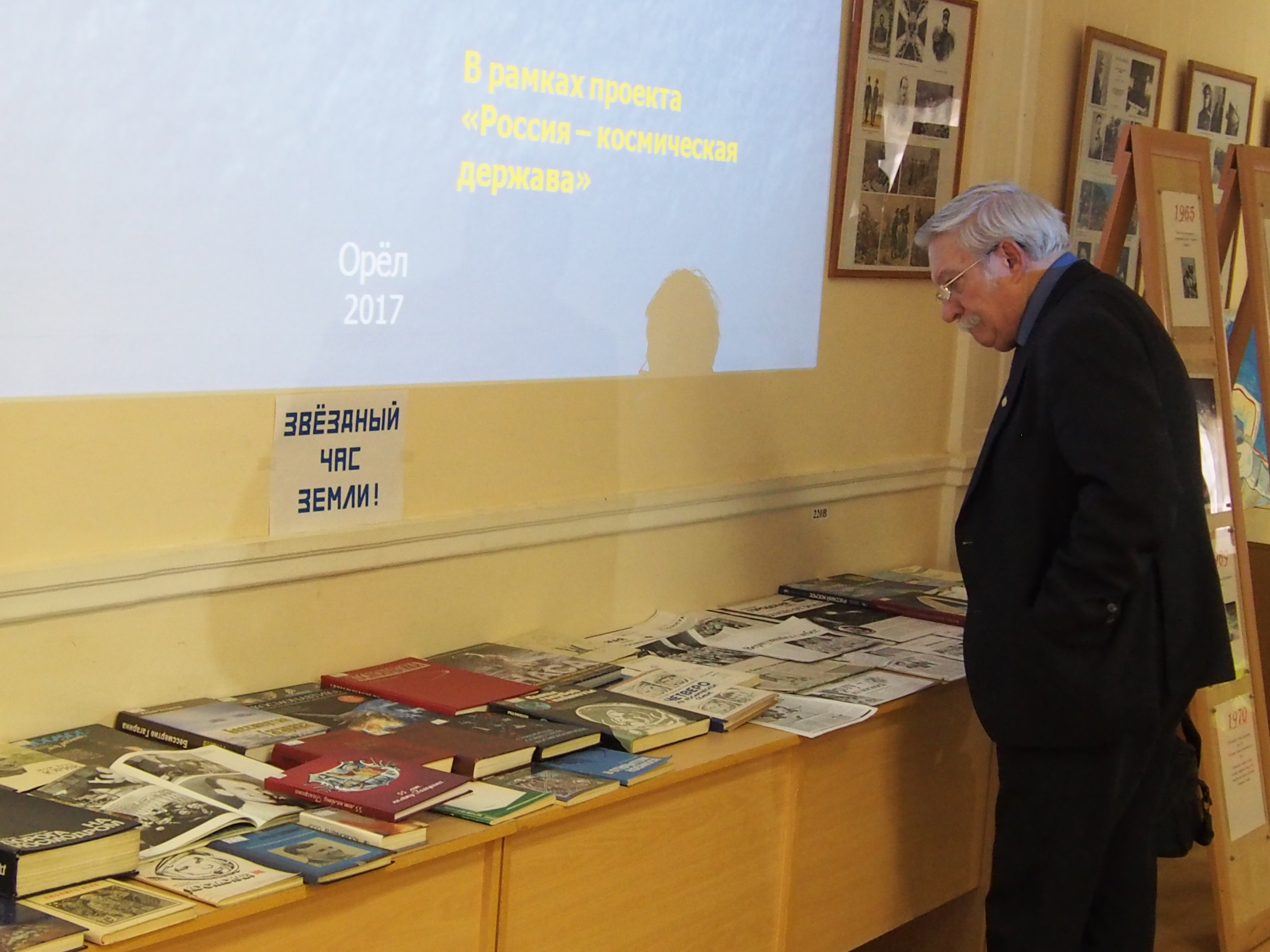 Савченко Александр Сергеевич – заведующий отделом культуры редакционной службы газеты «Орловская правда» государственного унитарного предприятия Орловской области «Орловский издательский дом» у выставки литературы о космосе