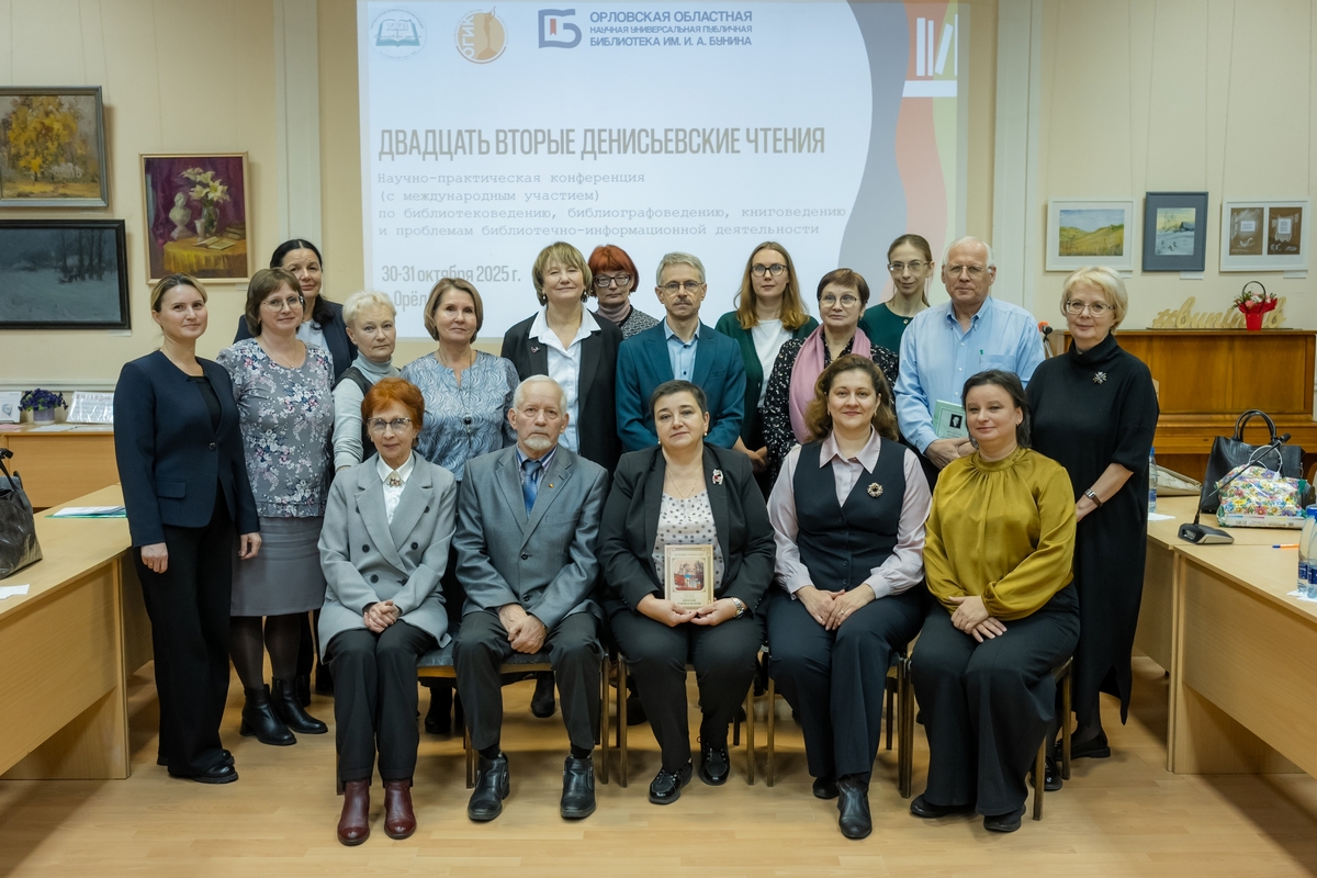 Научно-практическая конференция (с международным участием) по библиотековедению, библиографоведению, книговедению и проблемам библиотечно-информационной деятельности XXII «Денисьевские чтения» состоялась в г. Орле на базе Орловской областной научной универсальной публичной библиотеки им. И. А. Бунина и Орловского государственного института культуры 30-31 октября 2025 года. Конференция была посвящена 130-летию со дня рождения видного ученого, библиотечного деятеля, библиографа, педагога в сфере библиотечно-информационного образования Виталия Николаевича Денисьева.
