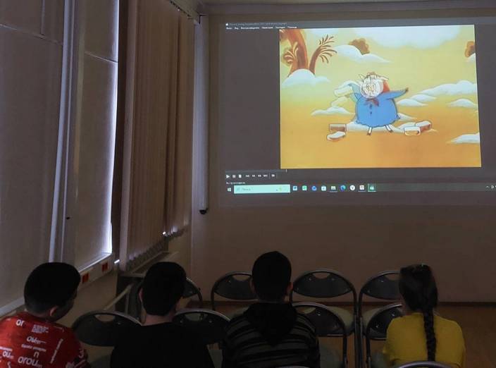 Участники мероприятия познакомились с советским мультфильмом «Зимовье зверей», созданный студией «Союзмультфильм» в 1981 году по мотивам одноименной русской народной сказки. После просмотра мультфильма участники выполнили познавательные и занимательные игровые задания. В конце мероприятия детям предлагалось собрать простые слова на английском языке.