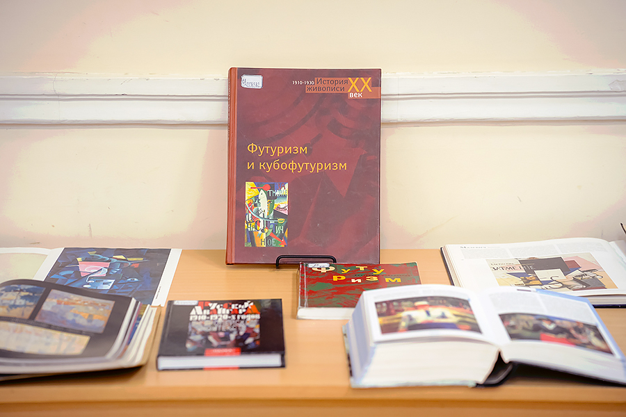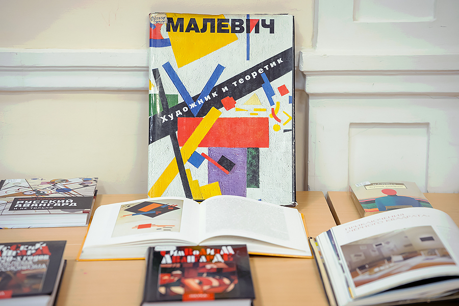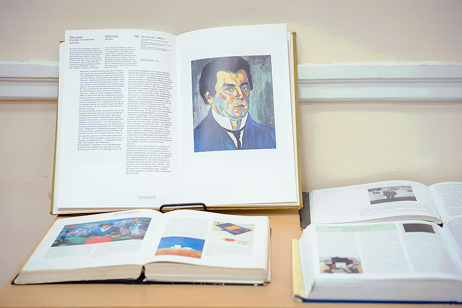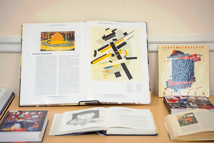 Посетители смогли познакомиться с биографическими исследованиями о жизни и творческом пути Казимира Малевича, а также с научными трудами, анализирующими философские основы супрематизма. На выставке были представлены каталоги выставок с участием произведений художника и альбомы с репродукциями работ мастера, демонстрирующие эволюцию стиля Малевича — от ранних импрессионистических работ до знаковых супрематических композиций, включая знаменитый «Чёрный квадрат». Гости выставки изучили публикации, рассматривающие влияние Малевича на развитие мирового искусства XX века, и ознакомились с репринтными изданиями теоретических трудов самого художника. Особое место на выставке заняли материалы, освещающие его педагогическую деятельность.