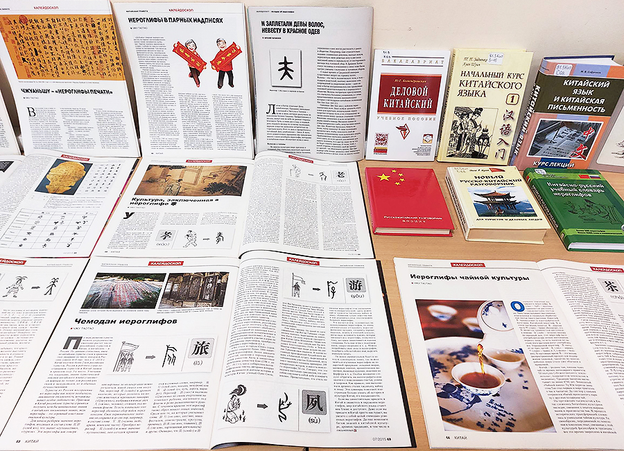 На выставке представлены учебники, учебные пособии и разговорники китайского языка, а также журнал «Китай».