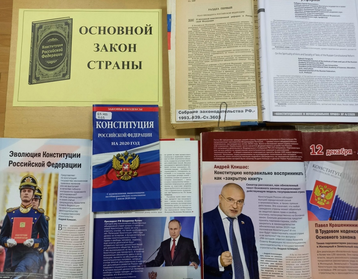 На выставке представлен действующий Основной закон Российской Федерации, а также официальные материалы, регламентирующие действующие к нему поправки. Общественно-политические журналы: «Конституционное и муниципальное право», «Общественные науки и современность», «Власть», «Журнал российского права», «Вестник МГУ. Сер. Политические науки» предоставили трибуну ведущим ученым, политологам, общественным деятелям. Авторы исследуют историю российского конституционализма с XVIII века до современности, анализируют задачи и противоречия конституционных реформ. Особое внимание уделяется проектам 90-93 годов двадцатого века. На страницах периодики обсуждается ряд общественно важных проблем: конституция как символ и инструмент консолидации; социальное государство – приоритет развития; конституционные основы российского федерализма и др. Эксперты сходятся во мнении о необходимости дальнейшего конституционного развития как фактора оптимизации политических процессов и отношений в России.