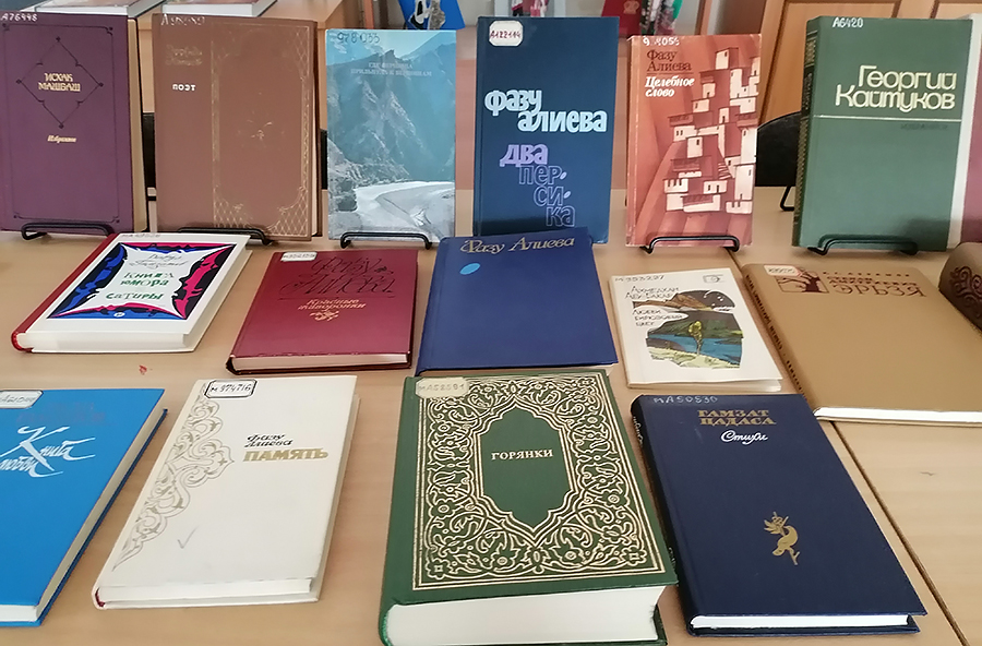 На выставке представлены произведения Кайсыма Кулиева, Алима Кешокова, Тембота Керашева, Исхака Машбаша, Георгия Хугаева, стихи Фазу Алиевой, Расула Гамзатова, Косты Хетагурова, Гамзата Цадаса и других писателей и поэтов Кавказа.