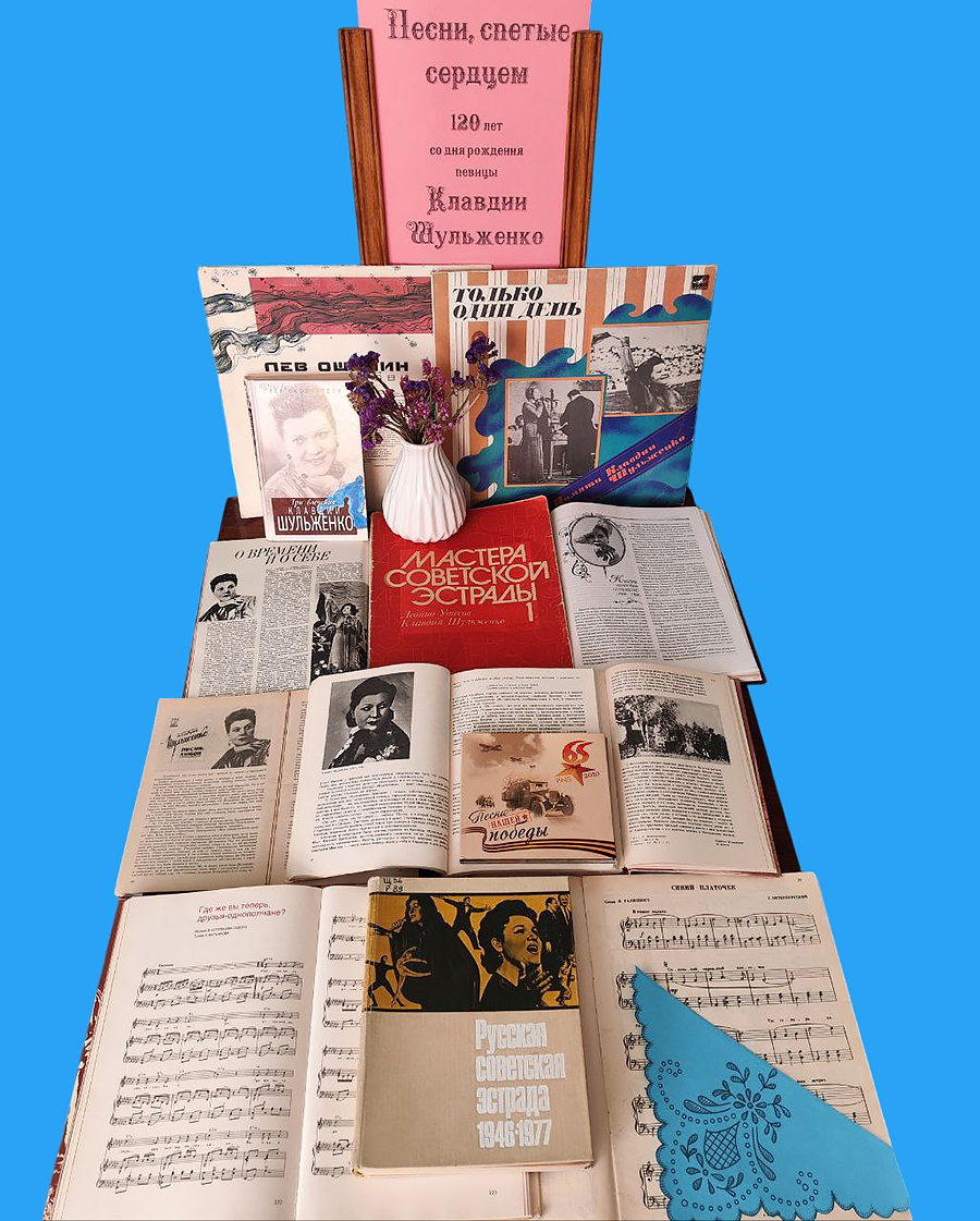 С 19 по 30 марта в отделе искусств Орловской областной библиотеки им. И. А. Бунина работает выставка музыкально-нотной литературы «Песни, спетые сердцем»: 120 лет со дня рождения певицы Клавдии Шульженко.