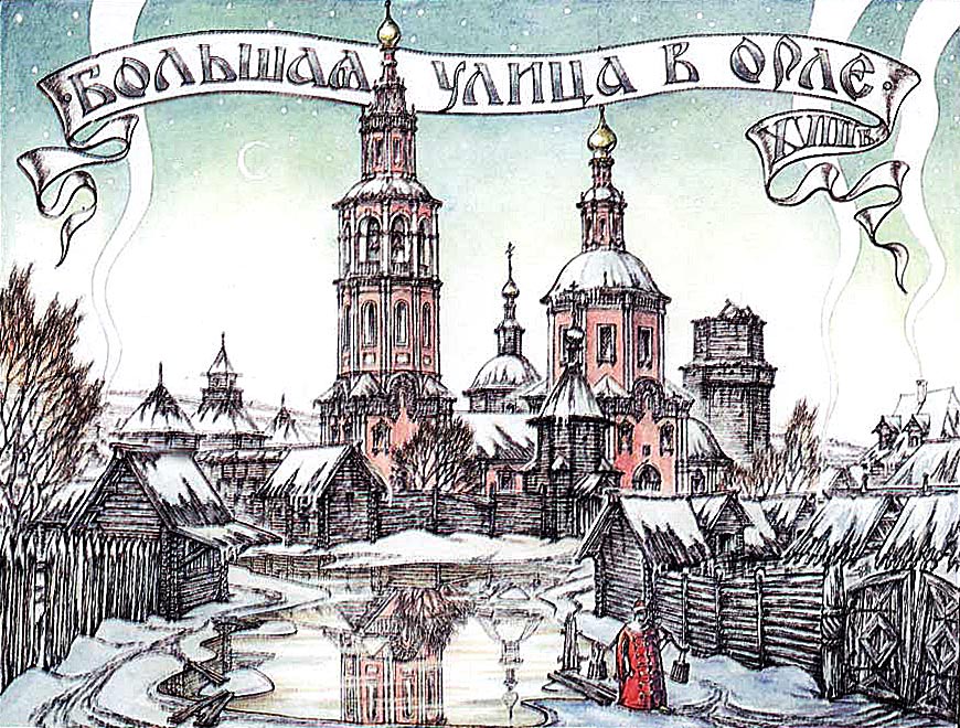 В левой части рисунка - Богоявленский монастырь с двумя церквами - шатровой Богоявления Господня и клетской Козьмы и Дамиана. Реконструкция В.М. Неделина После разорения Орла поляками и литовцами в 1606 году, происходит восстановление и укрепление Орловского острога. Одновременно с этим в 1641 году была построена деревянная Богоявленская соборная церковь. Вскоре рядом возведена церковь во имя святых князей Бориса и Глеба. И вокруг двух храмов образован мужской Богоявленский монастырь. После пожара 1680 года он был перенесен вниз по Оке на Ввозную гору, затем переименован в Успенский. Сама же Богоявленская церковь, хоть и не ясно, сгорела она тогда, или же сильно пострадала, обращена в приходскую.