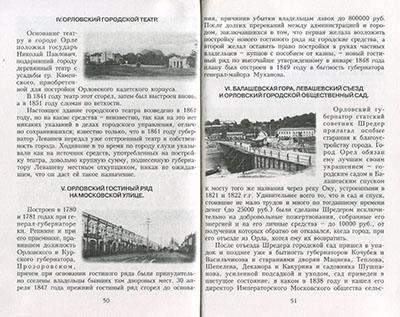 В разделе об Орле помещены краткие выдержки из «Орловского вестника» о географическом положении, климате, природе и промышленности Орловского края. Кречетов называет Орел 40-60-х годов XIX века одним из наиболее цветущих городов средней России, сосредоточием оживленной торговли и промышленности. Развитое судоходство, торговля хлебом, многочисленные крупорушные, пенькотрепальные и маслобойные заведения обеспечивали большое количество рабочих мест. При таких условиях в Орле кипела торгово-промышленная жизнь, городское население благоденствовало, город богател и развивался, будучи настолько полон жизненных сил, что даже страшные пожары 50-х годов, два раза истреблявшие около половины города, не подорвали его благосостояния. Однако, около 1872 года в положении Орла наступает поворот: торговля и промышленность города, а с ним и благосостояние его населения начинает падать. Открытие Московско-Курской железной дороги в значительной степени повлияло на уменьшение оборотов пристани по отпуску хлеба водой к петербургскому порту. С началом функционирования железных дорог возникла и конкурентная борьба, вследствие которой тарифы на перевозку продуктов земледелия до того утратили свой нормальный характер, что нередко дальность расстояния почти не играло никакой роли в этих тарифах. Следствие такого положения лишало местных торговцев и промышленников всякой возможности конкурировать с посторонними лицами, покупающими хлеб на местах производства за счет заграничных фирм. Такая постановка тарифного дела убийственно повлияла на положение города Орла. Из 500 хлебных торговых фирм осталось не более 20, ведущих свои обороты в самых ограниченных размерах. Автор подробно описывает ситуацию, сложившуюся в орловском городском общественном банке и причины его крушения в 1883-1884 гг. Кречетов дает статистические сведения об Орле на конец 1890-х годов: количество жителей, жилых домов и торговых лавок, церквей и часовен. Сравнивая Орел с другими городами, называет его просвещенным; поскольку не всякий губернский город может похвастать наличием целого ряда учебных заведений, в числе которых: институт благородных девиц, кадетский корпус, духовная семинария, гимназии и реальное училище.