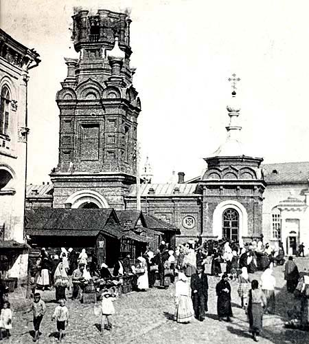 В левой части рисунка - Богоявленский монастырь с двумя церквами - шатровой Богоявления Господня и клетской Козьмы и Дамиана. Реконструкция В.М. Неделина
