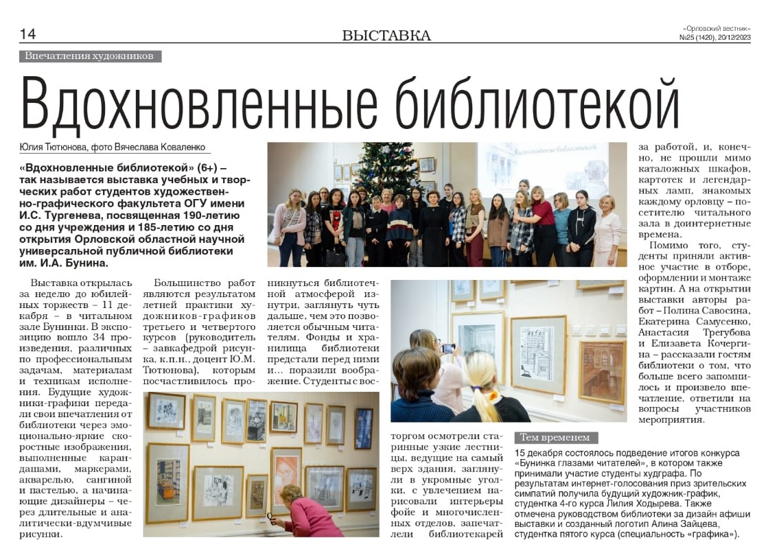 Тютюнова Ю. Вдохновлённые библиотекой // Орловский вестник. 2023. № 25 (20 декабря). С.14. |